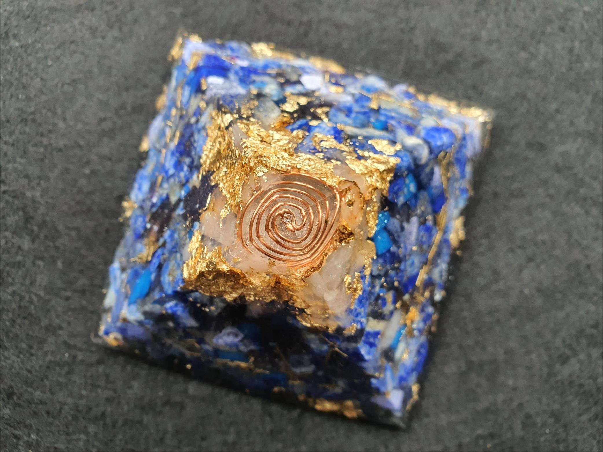Orgonite comes in different shapes and sizes, ranging from pendants, pyramids and other sculptures. Each handmade piece of orgonite contains a combination of crystals such as amethyst, pink quartz or rock crystal, selenite, as well as metals such as copper brass or iron. Our orgonite pyramids also contain 24 carat gold leaf. Also added to each item is the special material Shungite. Shungite is a black rock found only in the Karelia region of Russia. It is known for its healing and purifying properties and has a unique composition rich in carbon molecules.