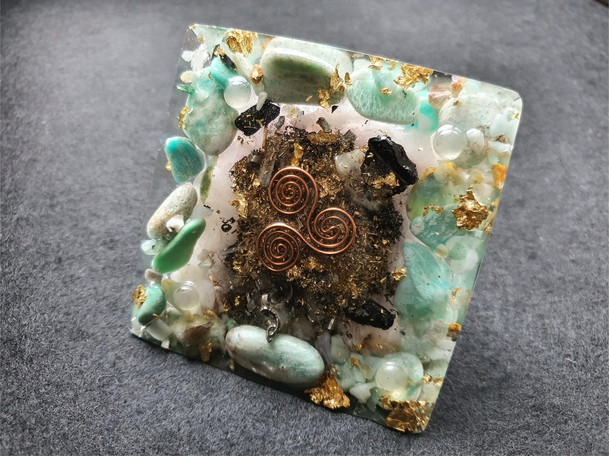 Since then, the concept has been perfected and become the current mix of synthetic resin, gemstones and minerals, iron grindings and aluminum grindings, copper wire and 24-karat gold leaf. The gemstones generate positive orgone which is then amplified by the metals. As the resin shrinks during the making process, a pressure is created on the gemstones to create the piezo effect or zero point energy (the original energy in the cosmos).